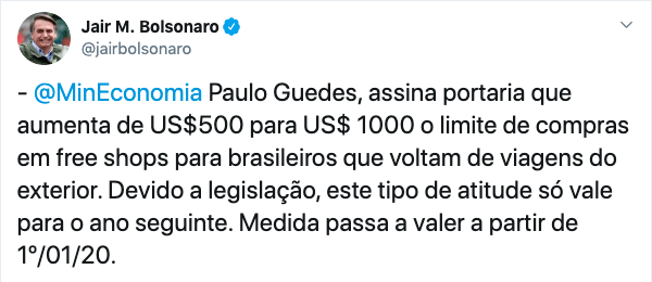 O presidente Jair Bolsonaro informou pelas redes sociais, que a partir do dia primeiro de janeiro de 2020 o limite para compras em free shops vai passar dos atuais US$ 500 para US$ 1.000. Segundo o presidente, a portaria já foi assinada pelo Ministro da Economia Paulo Guedes e a mudança só será permitida para o ano seguinte por causa da legislação.