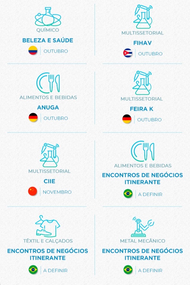 Das 40 ações previstas até 2021, ao menos 8 ocorrerão ainda em 2019, entre outubro e dezembro. Entre elas, uma missão prospectiva à Feira Anuga, que movimenta o ramo de alimentos e bebidas mundial e ocorre bianualmente na Alemanha e missões prospectivas aos eventos multissetoriais Feira K, na Alemanha, e à CIEE, na China. Também estão no planejamento encontros itinerantes de negócios com compradores estrangeiros em diversas cidades brasileiras.