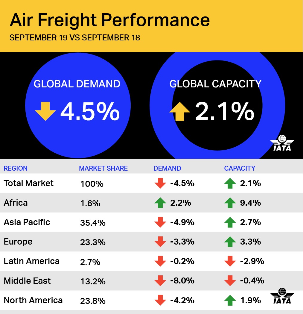 As companhias latino-americanas sofreram uma queda na demanda de frete aéreo em setembro de 2019 em 0,2% em relação ao mesmo período do ano passado e uma queda na capacidade de 2,9%. Apesar das indicações de recuperação da economia brasileira, a deterioração das condições em outros locais da região, juntamente com a desaceleração do comércio global, impactaram o desempenho da região.