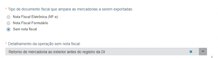 As operações da espécie, nas quais não há emissão de notas fiscais de exportação, devem ser registradas na opção de DU-E sem nota fiscal e motivo de dispensa conforme imagem abaixo: